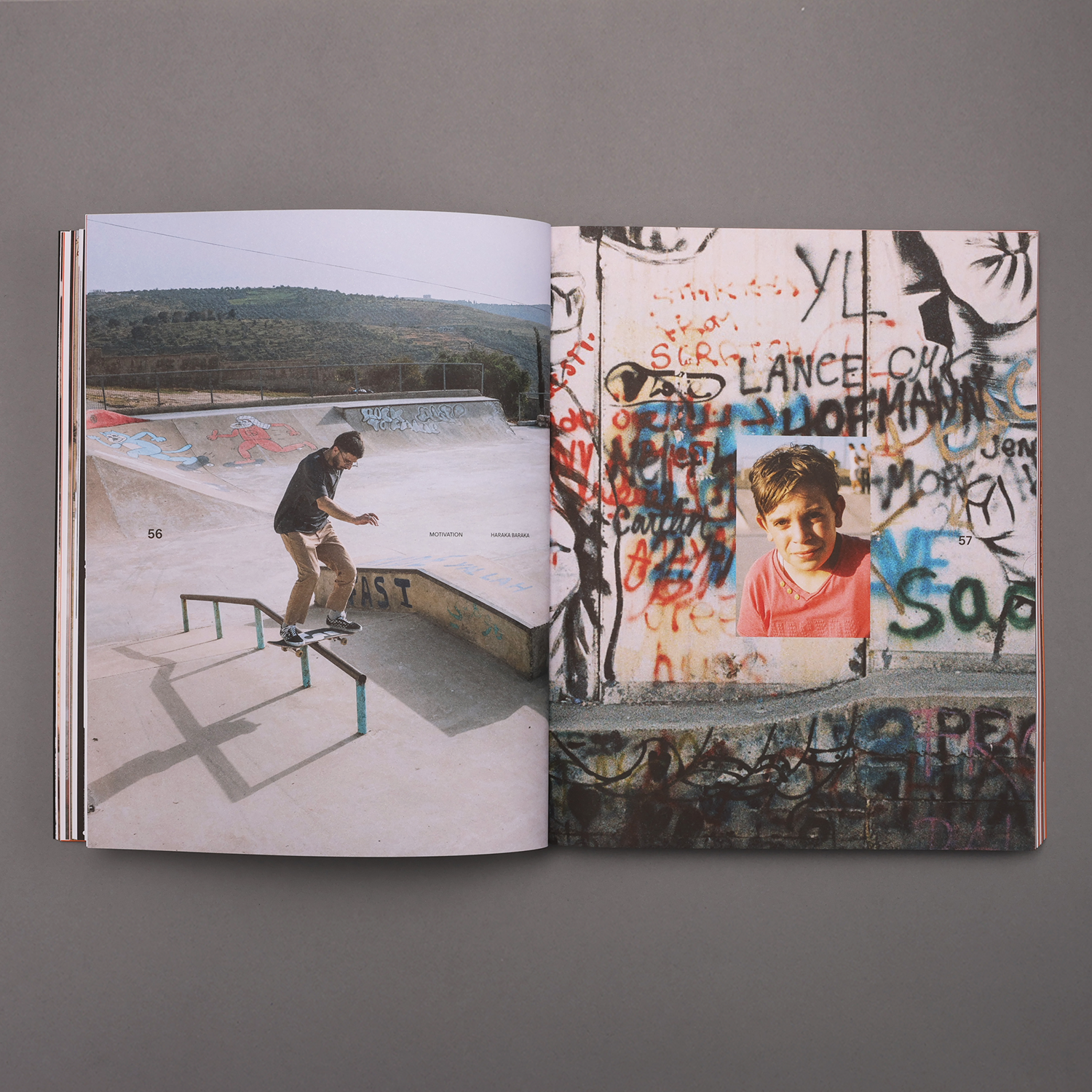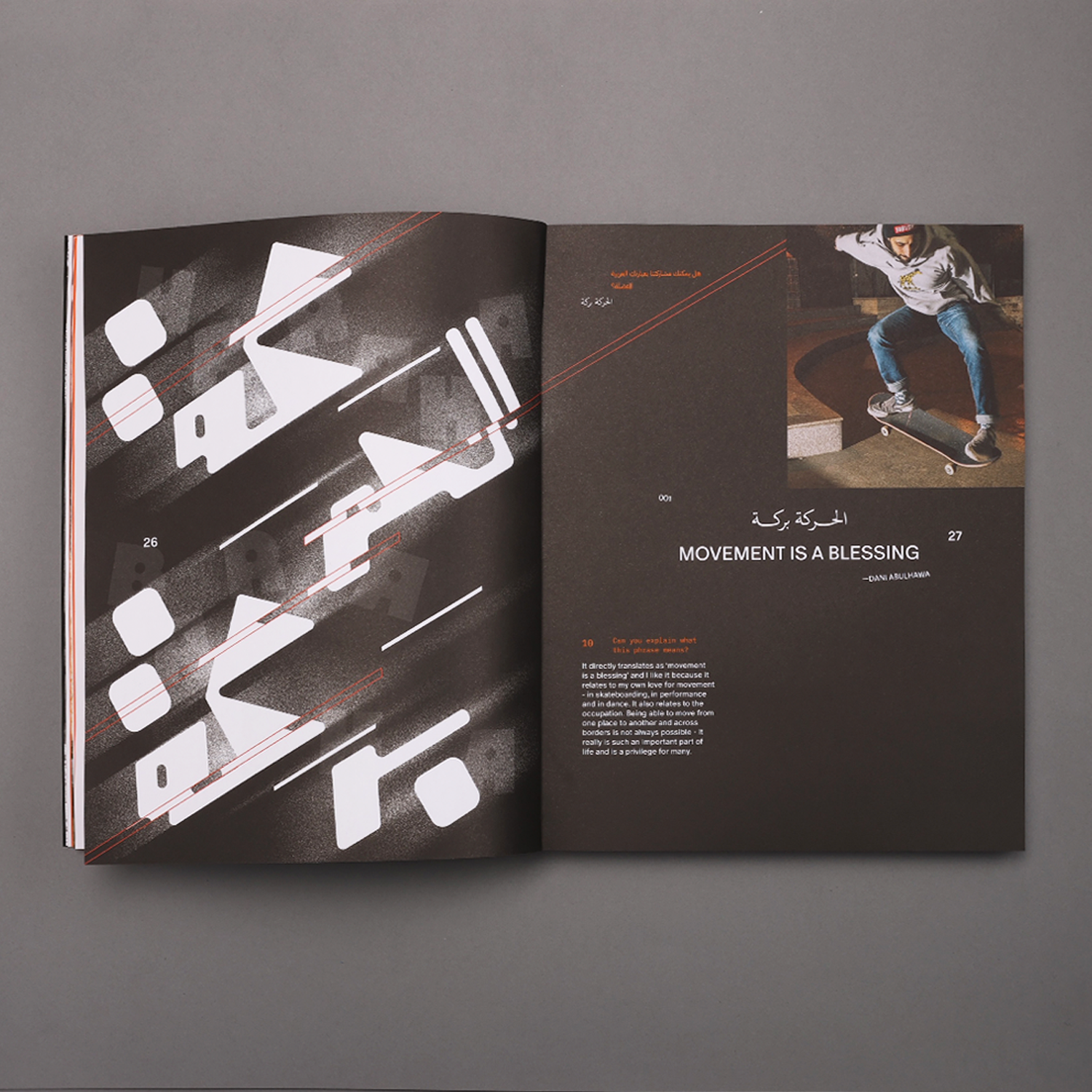 Our second book is a collaboration with the incredible Lebanese designer Samar Maakaroun, and over 224-pages Haraka Baraka gives a unique introduction to the Arabic language explored through a collection of expressions, ranging from simple everyday phrases shouted in the street, to more complex proverbs steeped in history. Many contributors are actively involved in our skateboarding programmes, others are part of the global Palestinian diaspora, and some are simply Arabic-speaking fans of what we do.