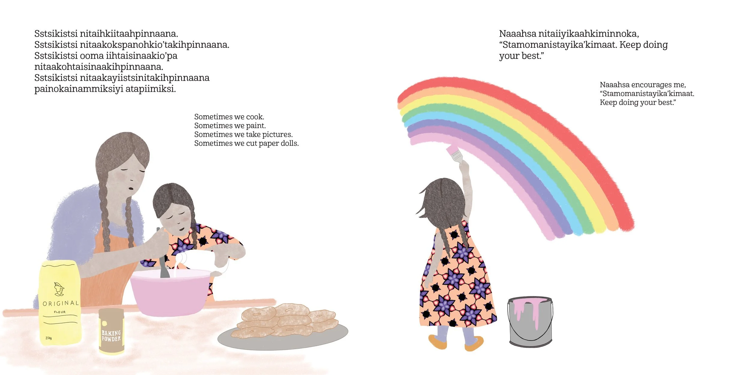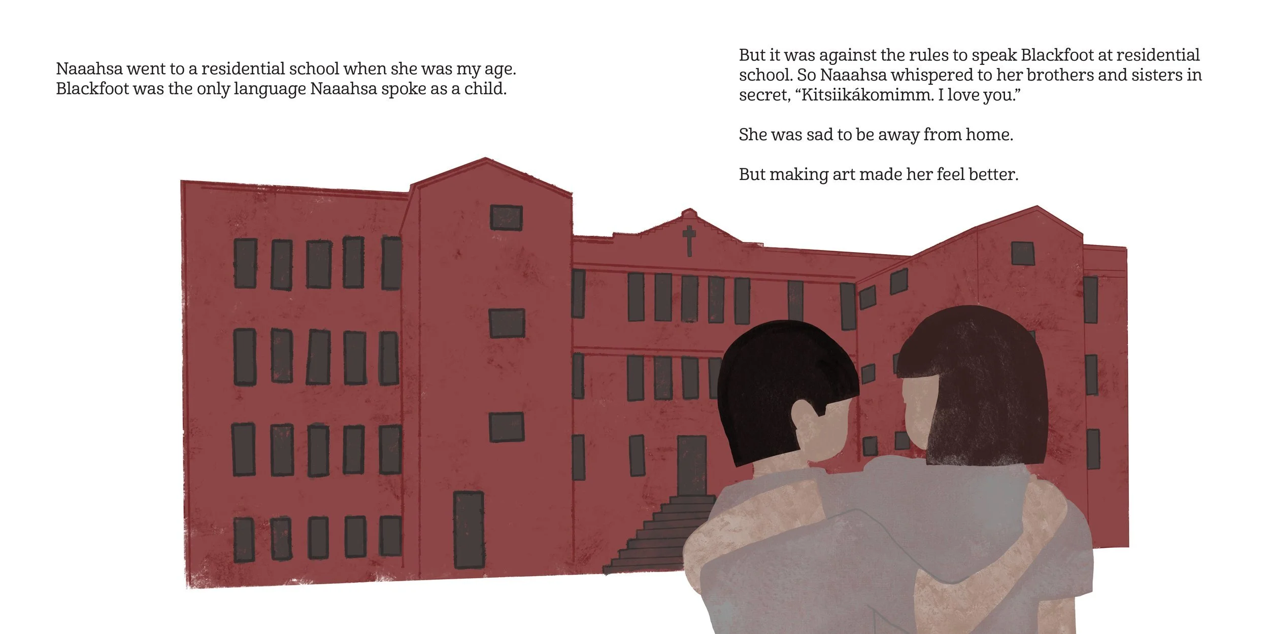 Naaahsa says art is a language everyone understands. Sometimes we make art together. We draw, we bead, we sing. Sometimes Naaahsa tells stories in Blackfoot. I even get to go with her to see her art show at the National Gallery. Naaahsa is famous for her art, but I love her hugs best!
