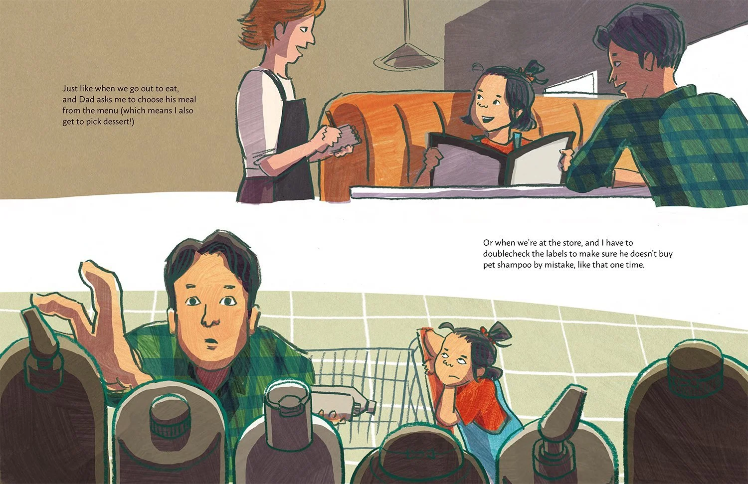 Angie is used to helping her dad. Ever since they moved to Canada, he relies on her to translate for him from English to Chinese. Angie is happy to help: when they go to restaurants, at the grocery store, and, one day, when her dad needs help writing some signs for his work.